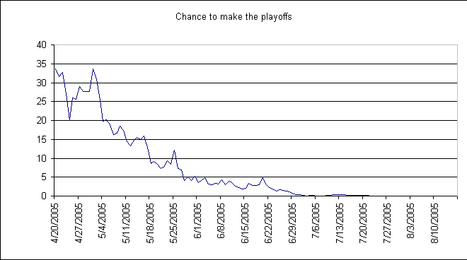 Clay Davenport over at Baseball Prospectus does this odds thing where the computer does a huge number of simulations about who needs to beat who and when to get into the playoffs, and fortunately for us, there’s historical information so we can see the team’s chances decline over time. It’s pretty depressing.