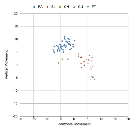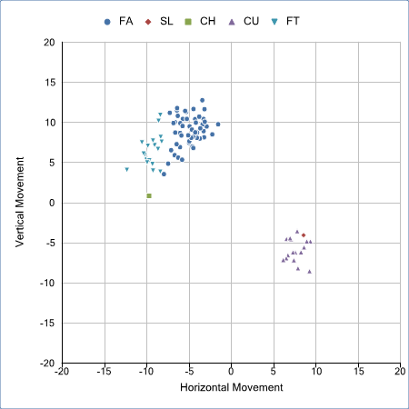 Of interest is the small cluster of curves in the bottom right. One’s labeled a slider when it probably shouldn’t be,* but it doesn’t really matter. That cluster of pitches has similar movement and similar speed (you can see more charts from the game here).
