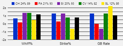 Each pitch is examined on three metrics: contact rate, strike rate, and ground ball rate. And each pitch is graded only against pitches of the same type from other pitchers. That means that Felix’s changeup is only compared to changeups thrown by others. For each pitch and each metric, I compute the league median and then grade each pitch by finding its median absolute deviation, which I express in the chart as z. Roughly speaking, it’s like finding the standard deviation, but better.
