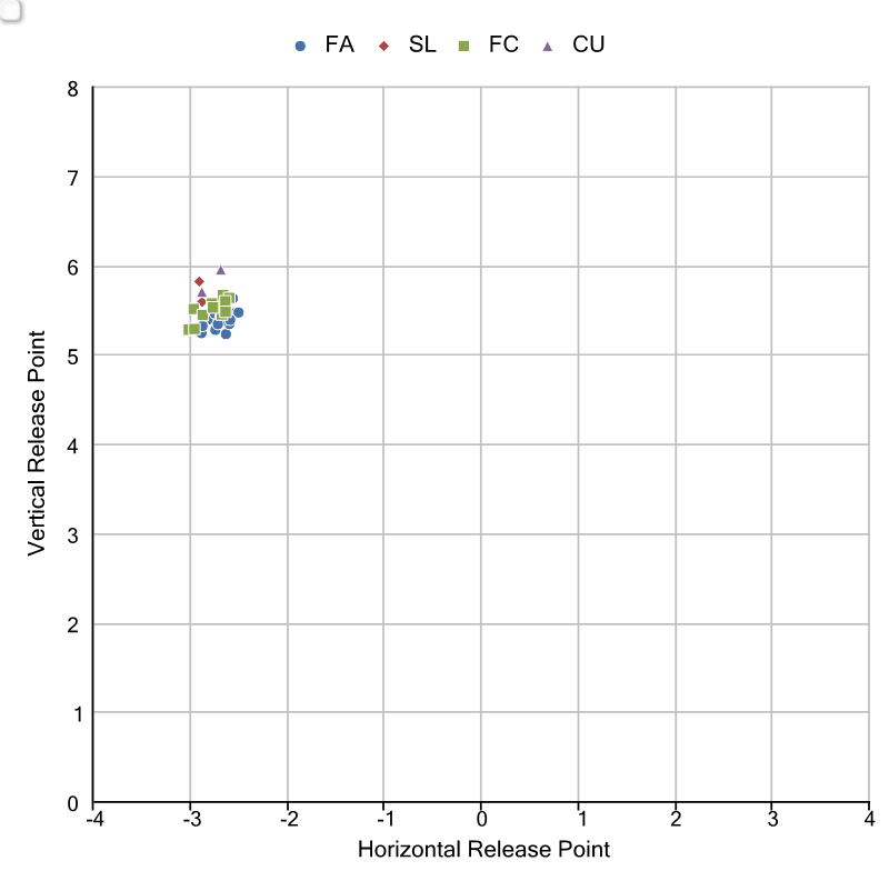 As you can see, the release point has gotten much, much higher, and he’s now releasing at something close to 3/4 rather than side-arm. Basically, he’s gotten more vertical, and his stuff has taken a big leap forward in the process.