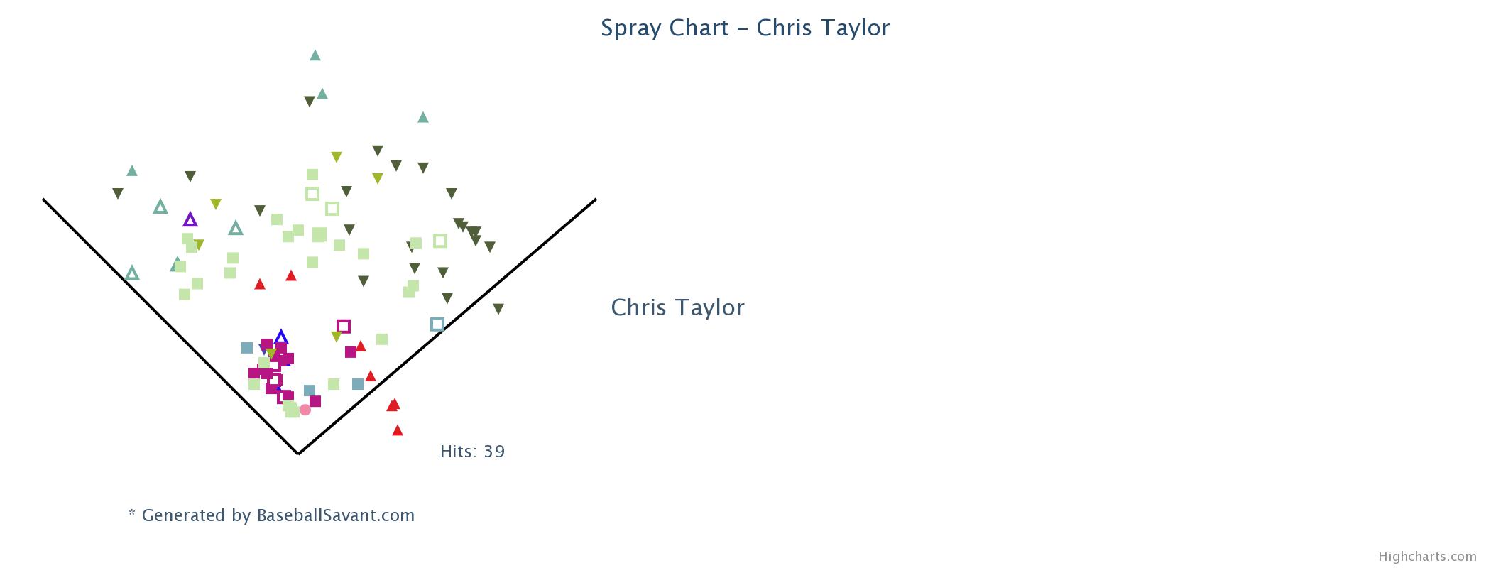 In part, the reaction to this move hinges on one’s view of Brad Miller’s defense. This seems like a religious debate; some people just *feel* that he’s shaky. To be up front, I’m not really in that camp. I don’t think he’s a gold glover, but I think he’s a perfectly average SS, whose good arm and range overcome some yips when he tries to do too much too quickly. For whatever it’s worth, he’s been a few runs above average over his career by UZR – that seems right to me, though many people obviously quibble with these (or any other) numbers. If you see Chris Taylor as an above average SS, that’s great, but he’s not replacing a Mike Morse-level SS defender – the gains, if they’re there, are somewhat marginal, particularly with a month of the season already gone. If you think Taylor’s better, I certainly wouldn’t argue the point, though. The problem is that Miller offers a bit more with the bat, as you can see in their rest-of-season projections. Miller‘s at a 96 and 99 wRC+ by ZiPS and Steamer, respectively, while Taylor clocks in at 90 and 88. Taylor’s strikeout rate is, by itself, not particularly troubling. What it does, though, is put more pressure on him to do damage when he puts the ball in play. And that’s not something Taylor’s ever really going to do. When Taylor hits the ball really hard, it tends to go up the middle.