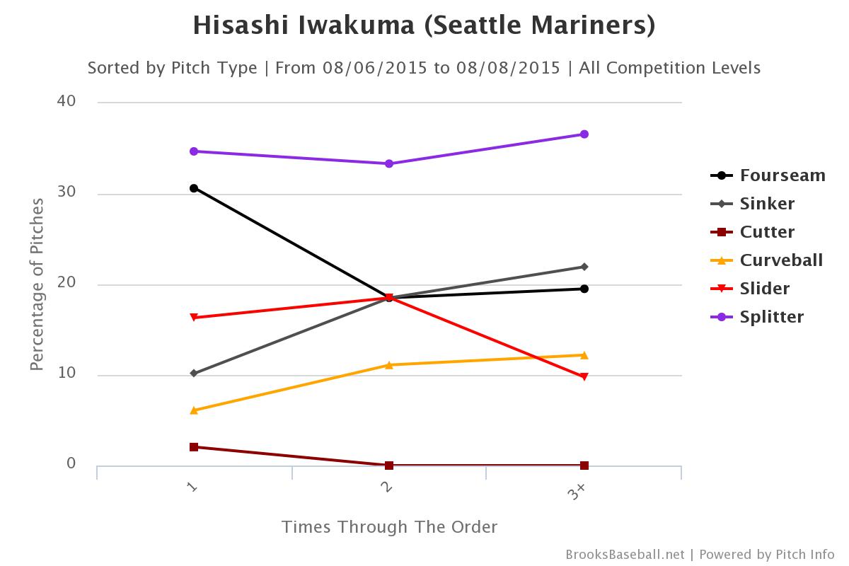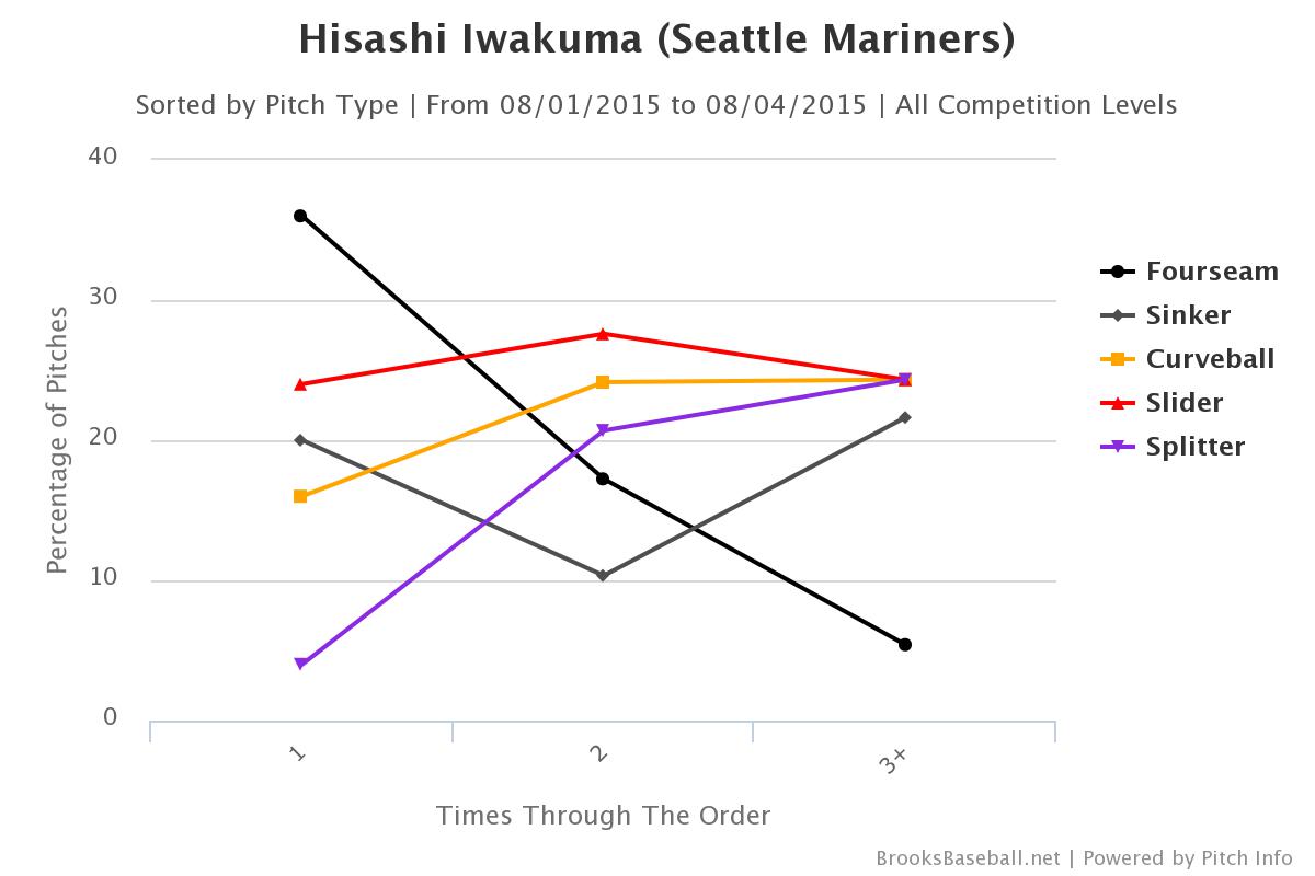 Hisashi Iwakuma’s no-hitter was a perfect example of a pitcher using unpredictability as a weapon. As Jeff’s great post at fangraphs shows, Kuma essentially used three different approaches – a fastball/slider-heavy look in the early-going, then splitters/breaking balls in the middle innings, followed by fastballs and splitters exclusively down the stretch. In the postgame show, Shannon Drayer asked Hisashi about his slider usage, noting that he threw more of them than normal. And many on twitter pointed out that he threw more *splitters* than normal. Both are true, but it was *how* and *when* he used them that set this new, junkballing version of Iwakuma apart.
