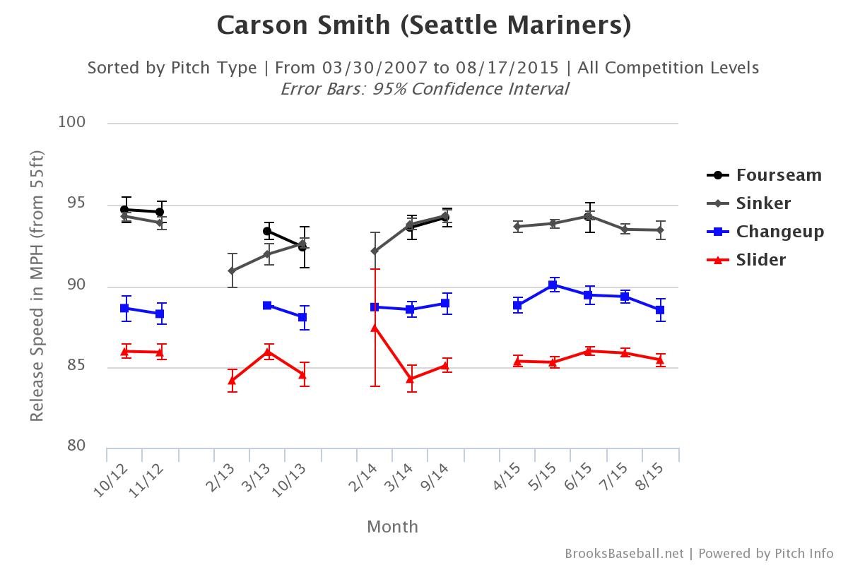 Carson Smith suffered another blown save yesterday, his 3rd of the year. As of mid-July, Smith was a nearly unhittable force of nature. His swerving, tumbling sinker and big slider combined to make life exceedingly difficult on lefties as well as righties, and, crucially, he had enough control that he wouldn’t give up many free passes. From the beginning of the year through July 12th, Smith allowed a triple slash line of . 169/.223/.262. His K:BB ratio was 47:6 in 36 1/3 IP, and while he had 3 HBPs, that’s still over 5 punchouts for every free baserunner. Because of the sink on all of his pitches, he was a ground-ball machine which made it next to impossible for batters to drive pitches in the air.
