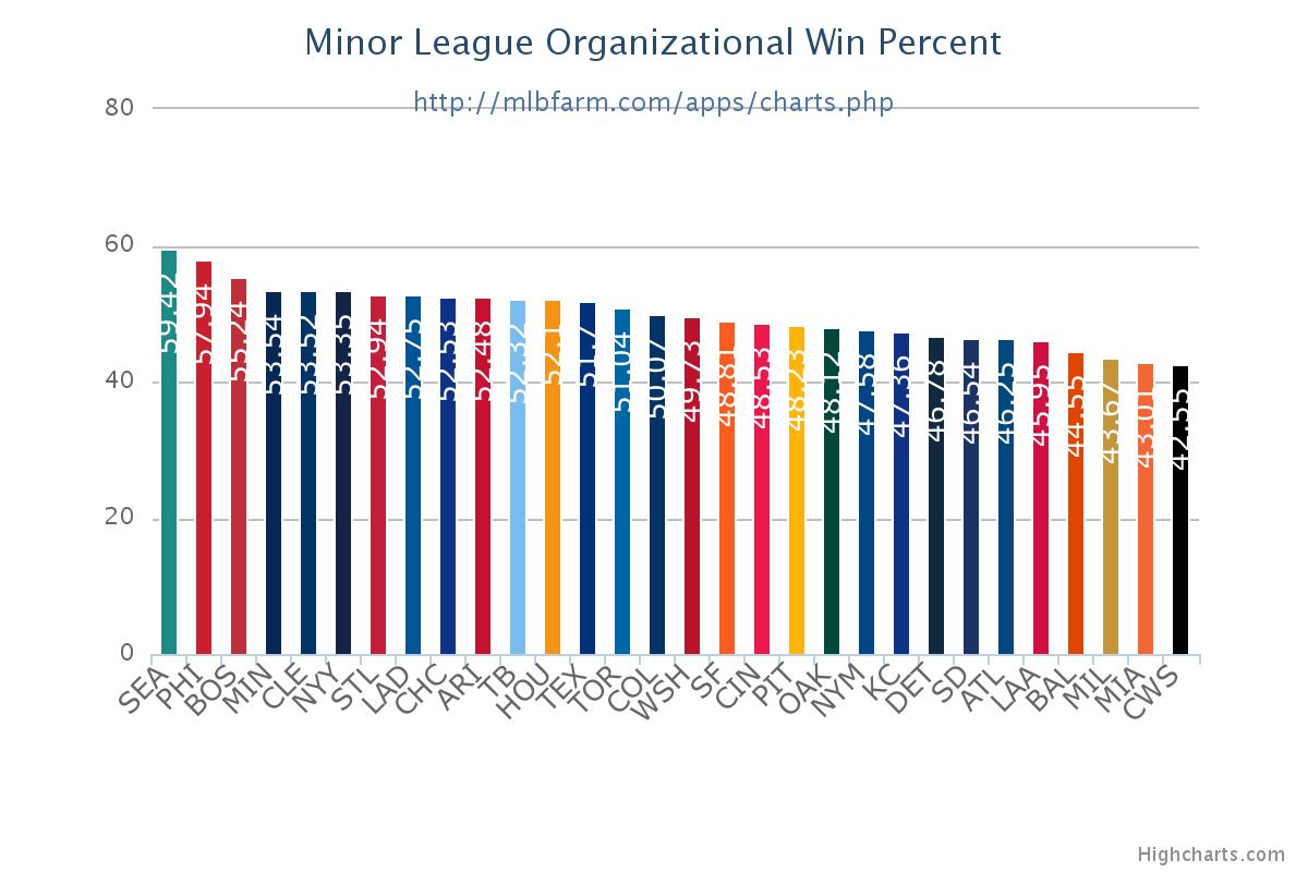 The Great Lakes Loons beat Clinton to lift the Midwest League championship trophy, so the season’s officially over in the M’s system. We’ve talked at length about the M’s disastrous 2015, so it’s only fitting to close it out with this chart, showing the M’s leading all of baseball with a minor league winning percentage of 59.4%. This will never stop being astonishing to me, especially given what happened a year ago. Is this a sign that the M’s farm system is a lot better than people think? Not exactly; you can win in the minors without blue-chip prospects. But it IS a sign that the front office’s talk about changing habits and building a winning culture was more than nice-sounding pabulum. Something’s going on.