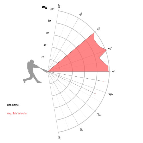 Gamel’s increased his batted ball speed too, to around 90 MPH, or above the league average. It’s not up with Motter or Ryan Zimmerman, but it’s playable. The big change with Gamel is his launch angle, which went from 3.7 to 11.8 degrees. Now, what used to be ground balls are turning into line drives. He’s shaved 15 percentage points off of his ground ball rate, and he’s yet to hit an infield pop-up, meaning those grounders are now LDs and fly balls. Here’s a visualization of his batted balls via Statcast.