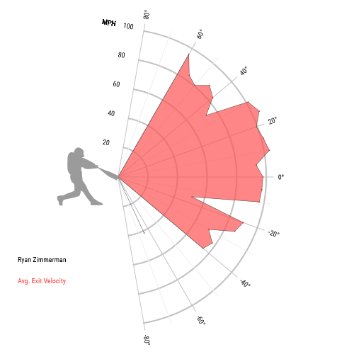 This year, Zimmerman’s launch angle has moved from 9 degrees waaaay up to…11 degrees. As far as revolutionary changes go, this leaves a little to be desired. Our poster boy for the fly ball revolution has the lowest average launch angle in the group. Luckily for him, changes don’t need to be sweeping to produce sweeping effects. He’s still got that tightly-bunched distribution of batted balls, but instead of centering below the average, it’s right on it. He’s hitting ton of balls at ~ 10 degrees: