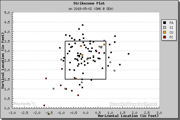 So, with all of that as prelude, let me wish you and yours a very happy Felix Day. The M’s welcome the wrecking crew that is the A’s offense, but also look forward to dealing with the A’s rotation. Andrew Triggs is still limiting HRs thanks to a great GB%, but he’s still not as effective as he could (should?) be given a persistently bad strand rate. Triggs throws a sinker, and then a slider and curve. It’s odd that his two big secondary pitches are similar, but they allow him to modify the horizontal movement a bit, given his low 3/4, nearly sidearm, mechanics. That curve’s been especially hard on lefties, and help counter what you’d expect would be devilishly high platoon splits. To be fair, his slider’s effective against them too, so he’s clearly got some deception in his delivery.