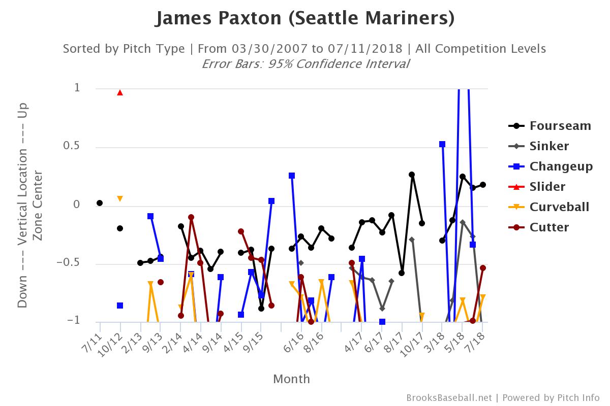 This isn’t universal or anything – Mike Leake still looks pretty much the same, which is funny given the narrow band his season stats move within – but there are enough that it starts to feel more like a pattern. To be clear: the M’s aren’t exactly doubling down on their “fly balls or bust” strategy from last year. They’re throwing fastballs up, but they’re throwing fewer four-seamers. The cutters are lower, and, in theory, can get ground balls. This strategy isn’t foolproof; they still give up HRs, and the cutters/sinkers haven’t been stellar, at least at the team level. But this strategy seems to have worked fairly well, at least for Gonzales and Paxton.