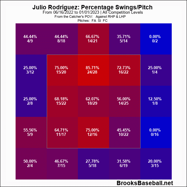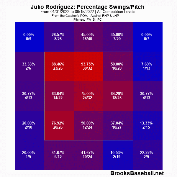 And a specific kind of fastball, too. Perhaps in an attempt to hit the ball in the air, Julio’s expanding his zone upwards, especially on fastballs. Here’s a heatmap of Julio’s swings against fastballs through June 15th. Not bad. Some questionable swings, but great for a young rookie.