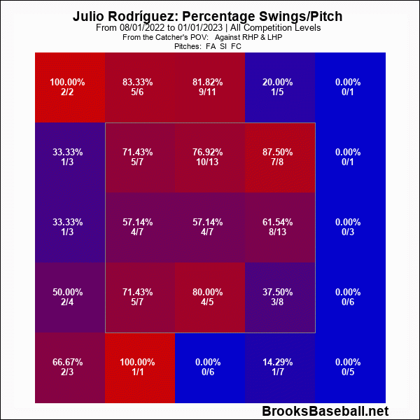 If we focus on the current month, it’s even more obvious. Julio’s trying to take high fastballs and drive them for home runs.